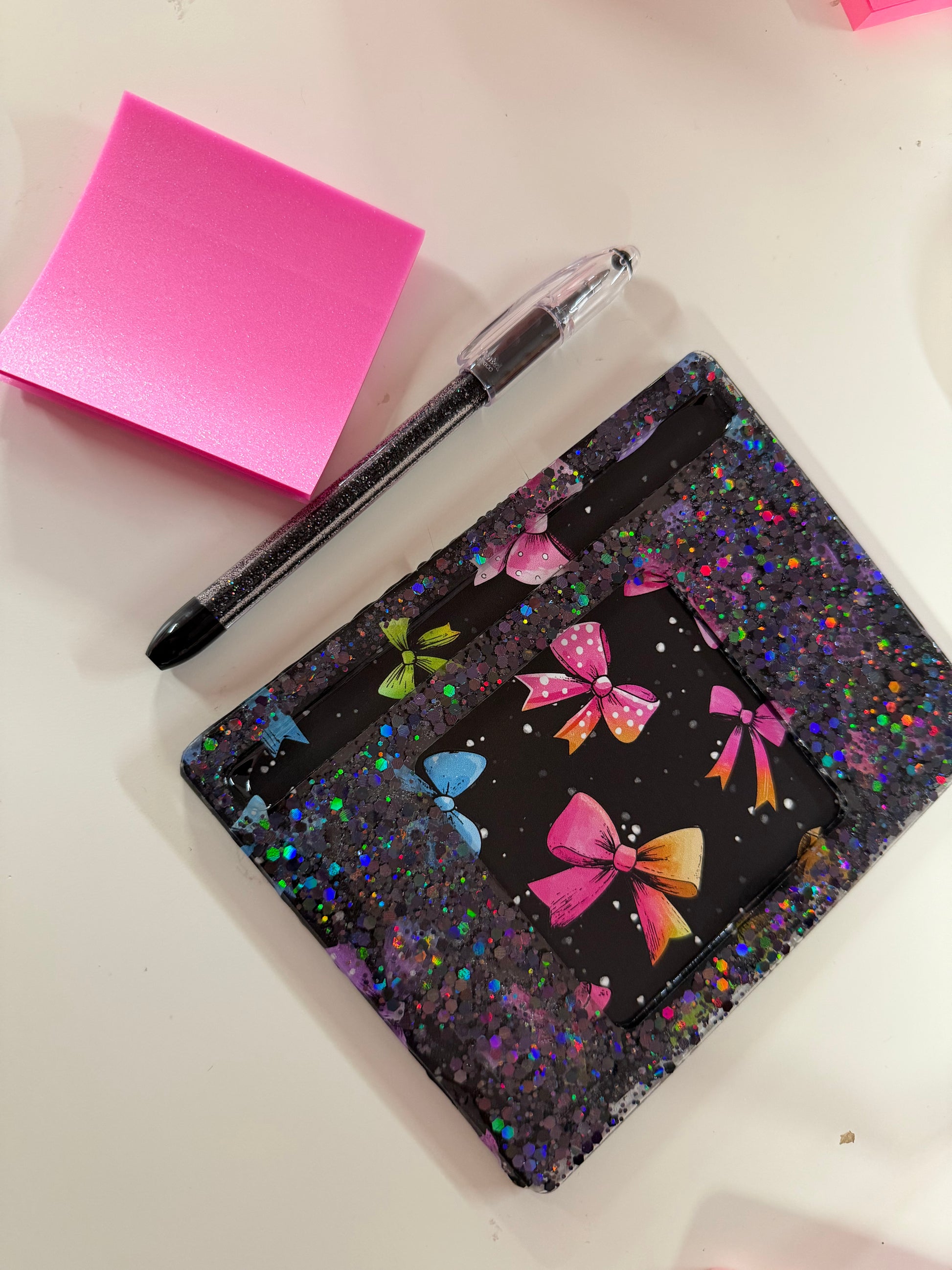 For the notepad/ pen holder you will receive a pack of glitter post its and a glitter pen to match! Name tag you can put whatever customization on there! For all acrylic pieces you will pick your designs and glitter on live!!! All orders will be made on live!